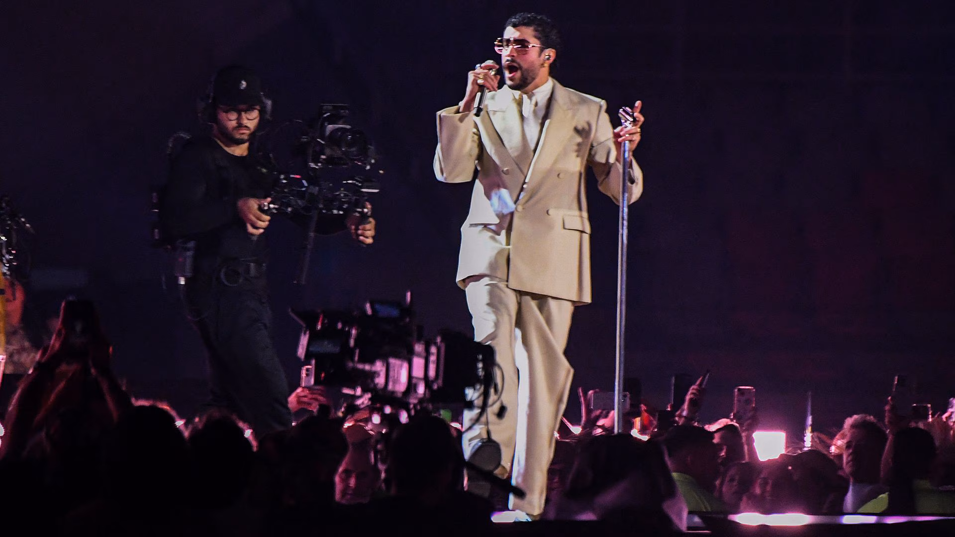 El cantante puertorriqueño abrió el show con “La Mudanza” y avanzó por una selección de temas que incluyó clásicos como Callaíta, Tití me preguntó, Me porto bonito, Yo perreo sola y Safaera. Además, interpretó “Chambea”, tema que dedicó especialmente a México, en una parte del espectáculo que elevó la energía entre los asistentes. La puesta en escena destacó por el uso de pantallas de gran formato, efectos de iluminación y un escenario alterno denominado “La Casita”, donde el artista cambió el tono de la presentación hacia una atmósfera más íntima y rítmica.